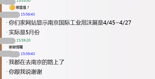 今天我們的客服們收到了一個(gè)投訴,我們的展會(huì)信息排期不對(duì),他已經(jīng)在出發(fā)的路上,要我們抱歉還問(wèn)有什么賠償。據(jù)咨詢客稱,他的身份不是參展商,是觀展的人。我們也沒(méi)有考證究竟是發(fā)布的展會(huì)錯(cuò)誤還是正確,咨詢客是否已在出發(fā)路上,還是我們被愚弄了。